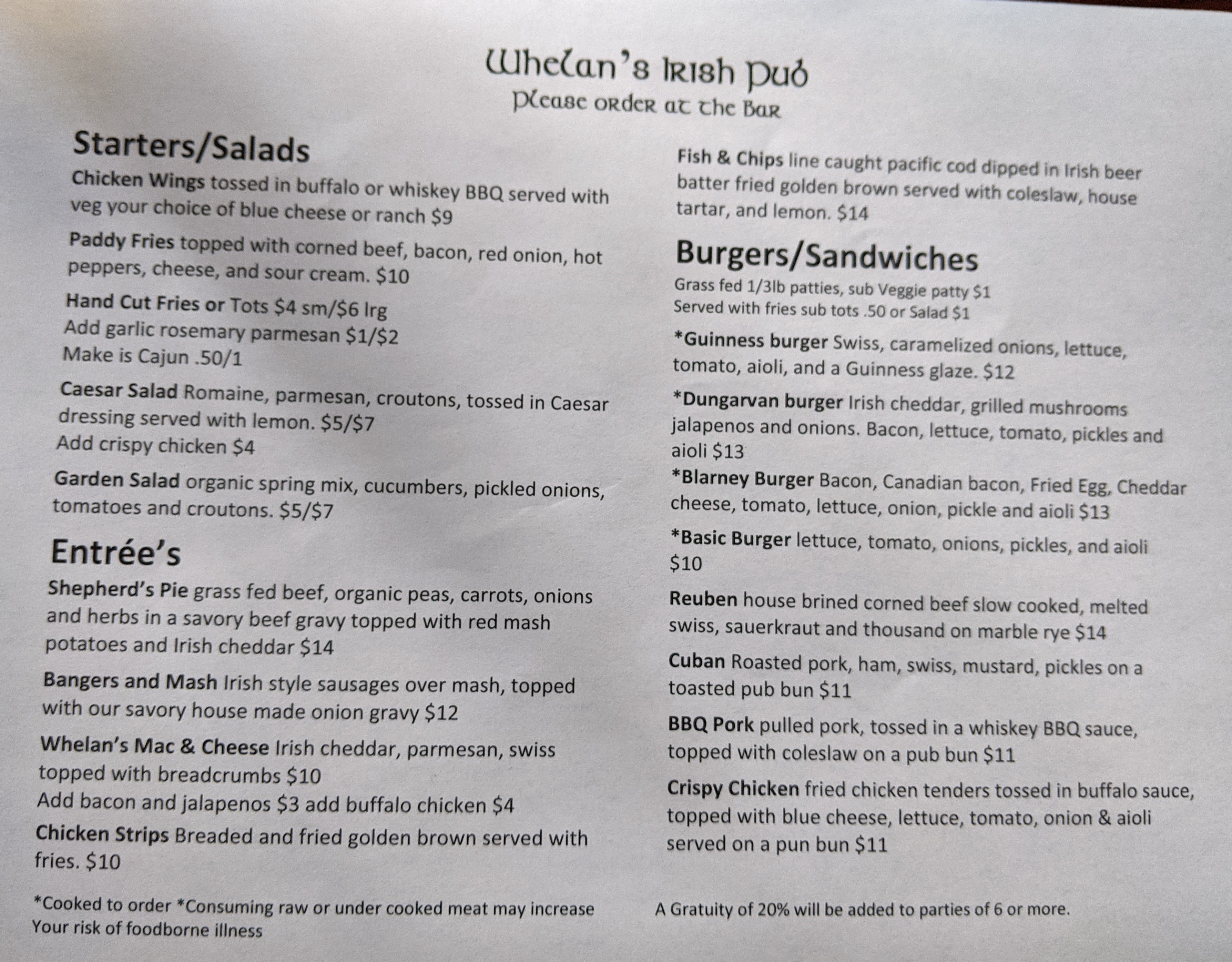 Everything we serve here at Whelan’s is hand made from scratch in our kitchen using the highest quality ingredients. We strive to make the best possible food for our guests, and we hope you enjoy every morsel!